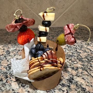 A cozy selection of cheeses, meats, fruit, and crackers, perfect for two to share